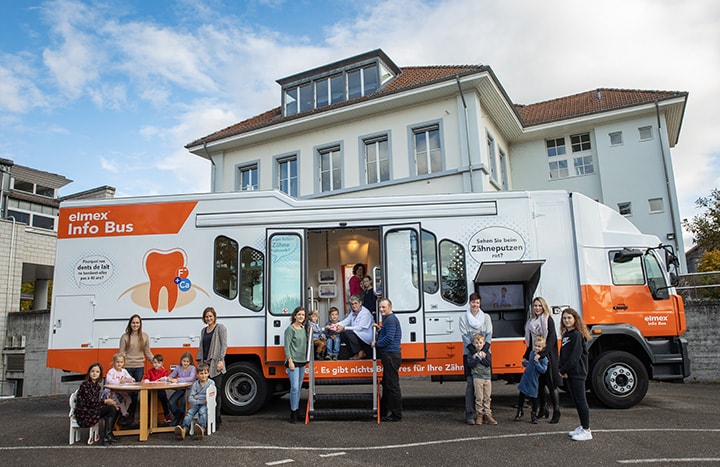 Seit über 25 Jahren ist elmex® mit dem orange-weissen Info-Bus in der ganzen Schweiz unterwegs.